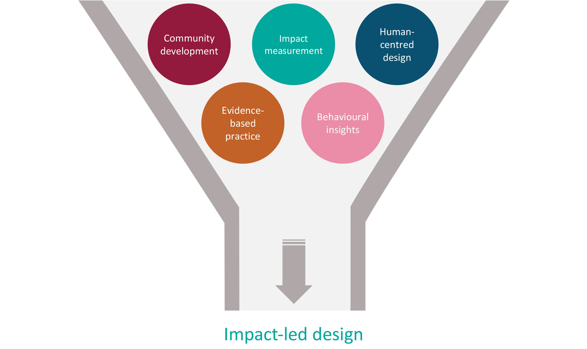 The impact-led design approach starts with the intended impact in mind, draws on the existing evidence base of what works and involves key stakeholders in co-designing the solutions. As indicated, the approach was influenced by good practice in a range of different disciplines including:
