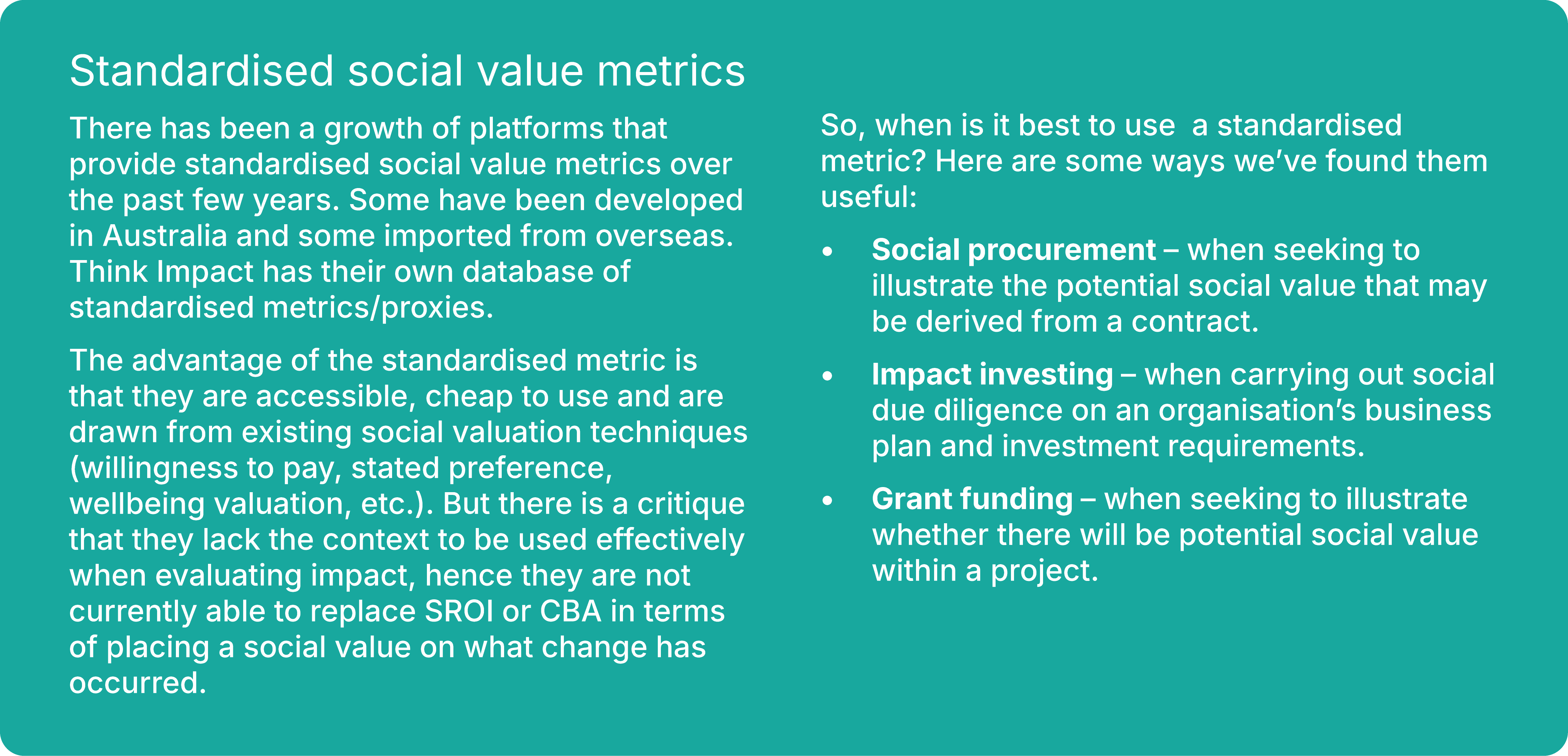 SROI offers a standardised approach rather than a set of standardised metrics that places the stakeholder’s voice about the outcomes at the centre of decision-making.