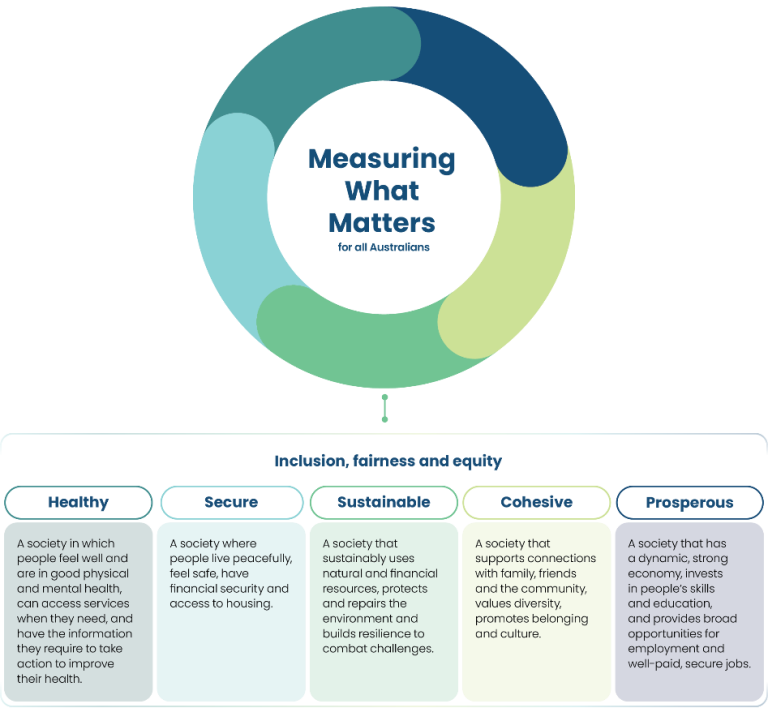 The Measuring What Matters Framework has five wellbeing themes, tracking progress towards a more healthy, secure, sustainable, cohesive and prosperous Australia. The intention is for the Framework to be embedded into government decision-making, inform policy development and evaluation, and support different levels of government to work better together.