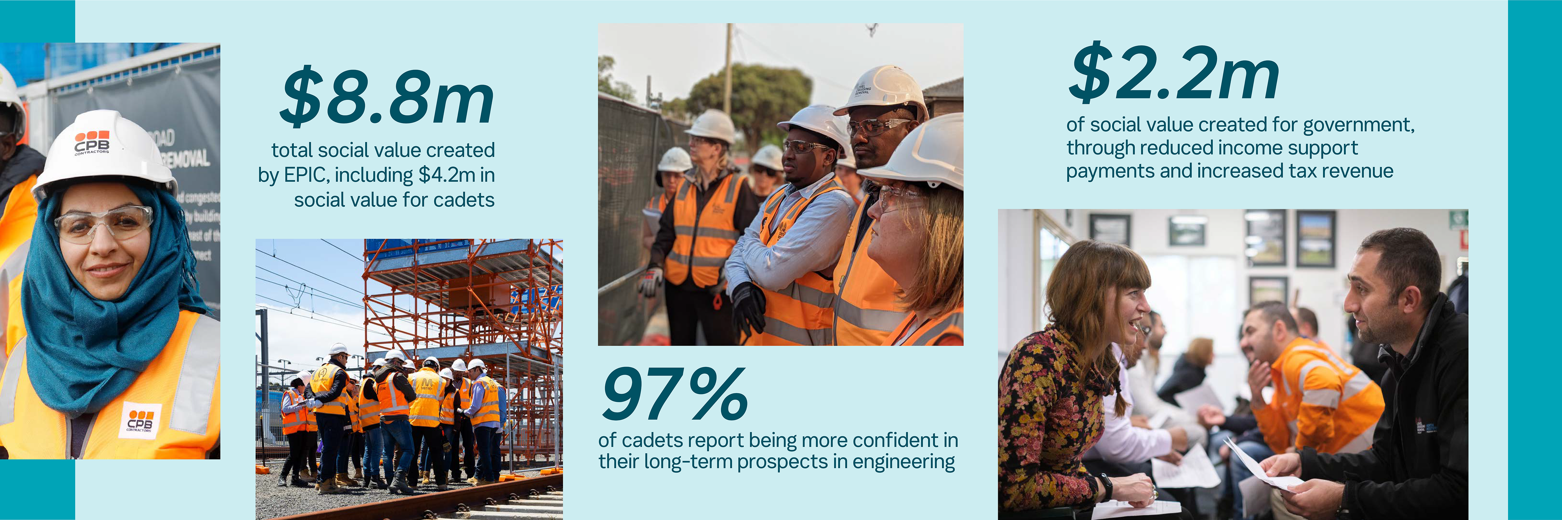 Think Impact was engaged by the Victorian Infrastructure Delivery Authority (VIDA) to determine the social value created by the EPIC program. The scope of the social valuation focused on the value created for 68 cadets, their family members and government (in their capacity as a provider of income support and the recipient of income tax) from LXRP’s three EPIC cohorts between 2021 and 2024.